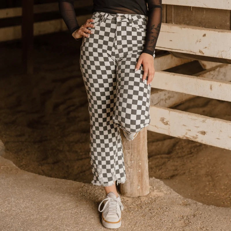 Make a bold statement with the Fast Lane Jeans, featuring a striking black and white checkered pattern that catches every eye.
